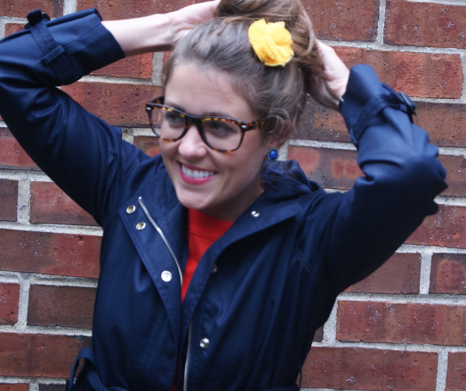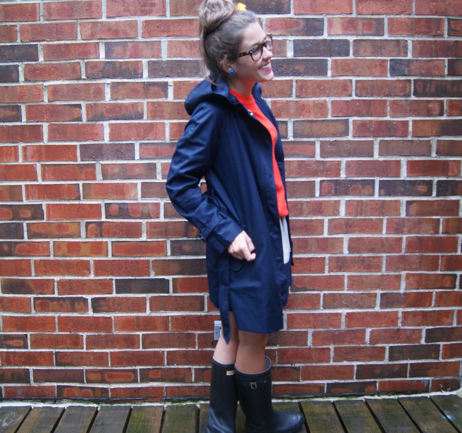 J.Crew Matinee Trench, J.Crew Tippi Sweater in Vibrant Flame, Zara Skirt {no longer available}, Hunter “Huntress” boots {a tiny bit shorter than the Hunter, because I’m a shrimp}, J.Crew flower hair clip {available in stores, not online}, my glasses are from See Boutique in Chicago {actually sunglasses that I had made into my glasses}.