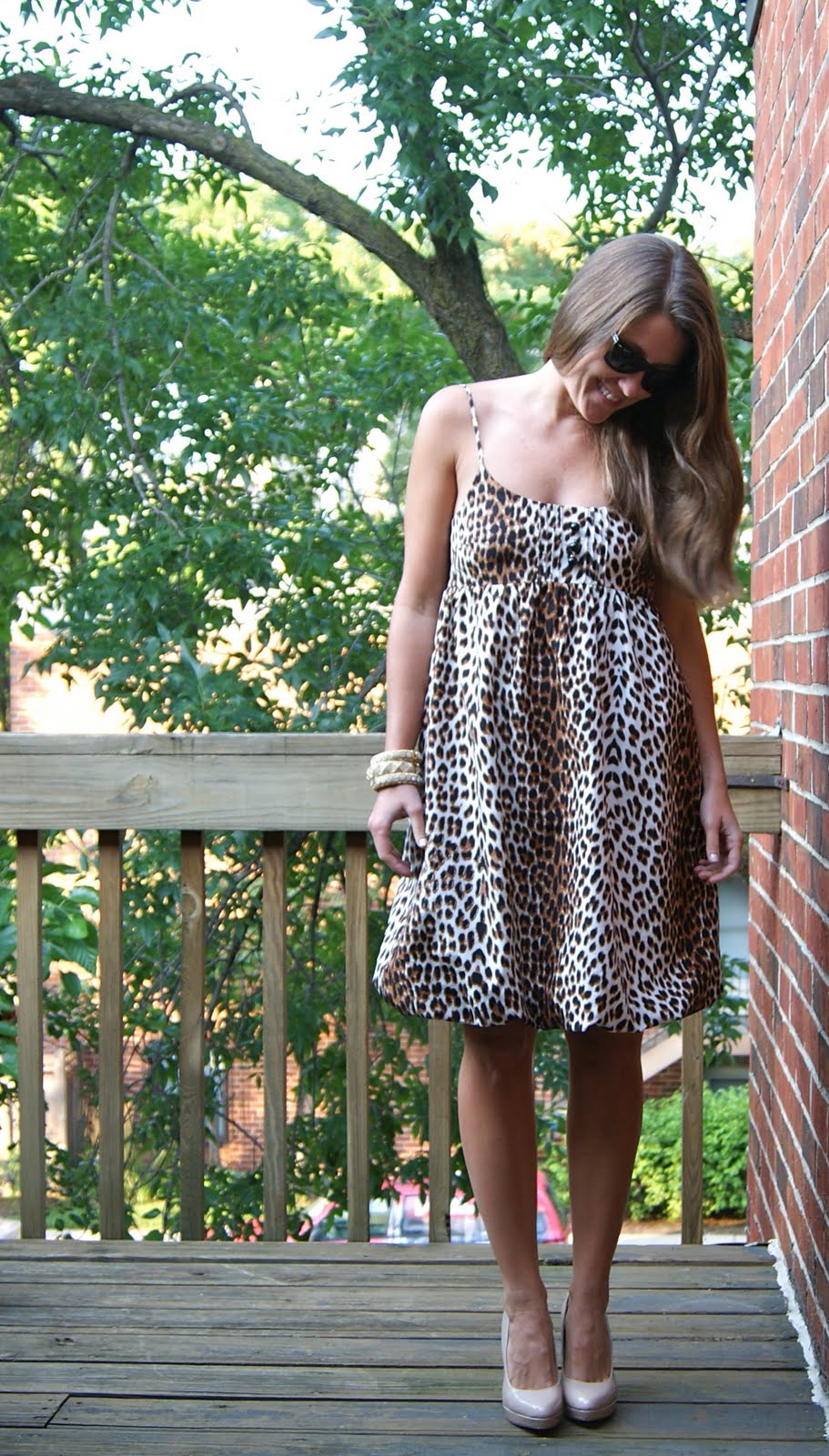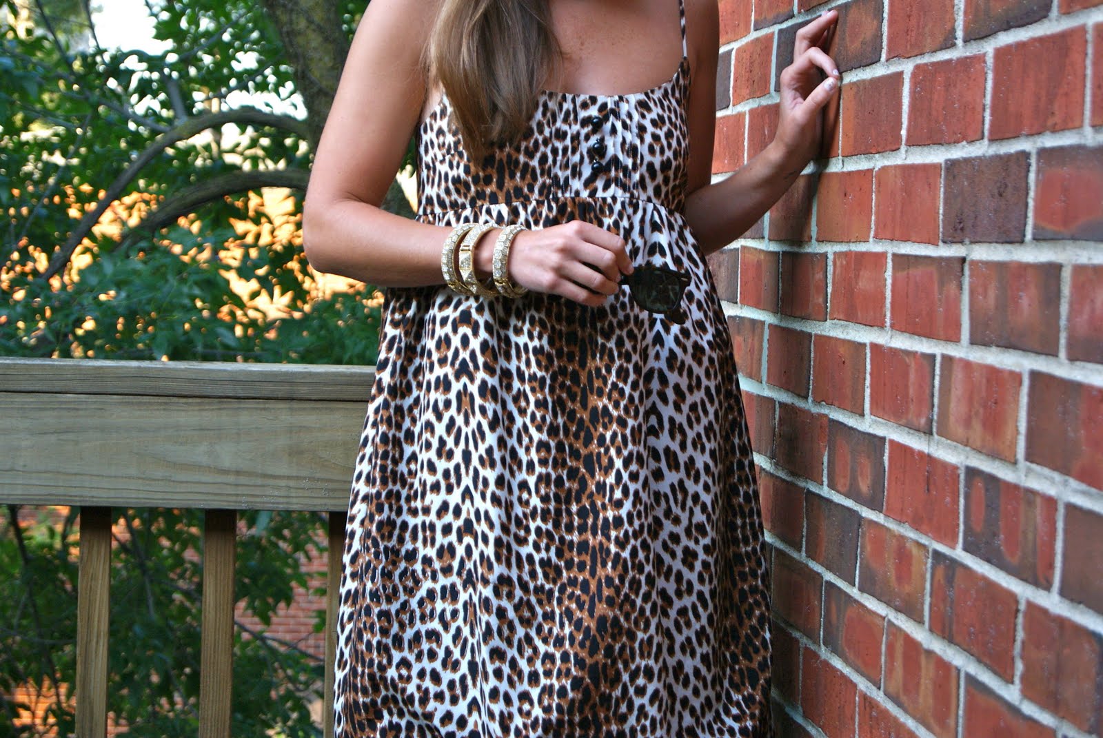 Julie Haus Leopard Dress {no longer available}, Ray Ban Wayfarers, Aldo shoes, miscellaneous bracelets from Henri Bendel.