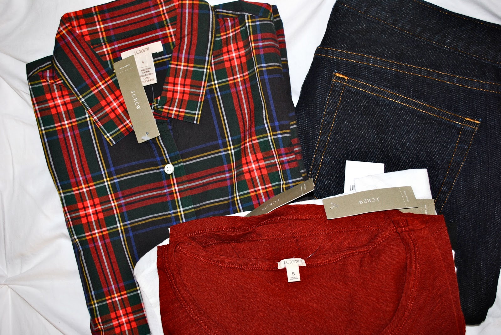 This J.Crew Perfect Shirt in Tartan, these J.Crew Vintage Cotton Ballet Tees, and these J.Crew Matchstick Jeansย {I had a credit}.