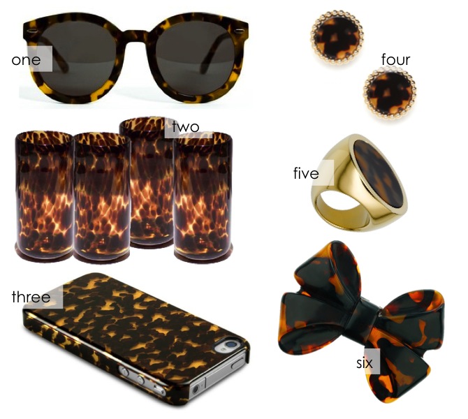 1 Karen Walker Super Duper Strength Sunnies is Crazy Tort 2 Furbish Tortoise Highball Glasses 3 Tortoise Snap Case for iPhone 4 Bauble Bar Tortoise Button Earrings 5 Michael Kors Tortoise Slice Ring 6 Dorothy Perkins Tortoise Shell Bow Clip