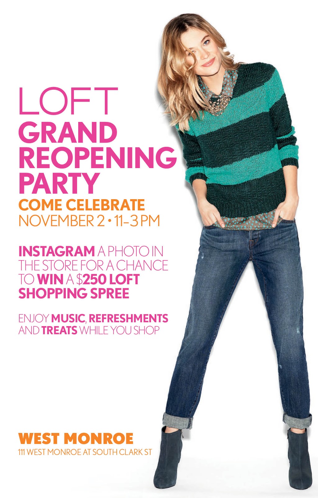 If you live and/or work in Chicago, I wanted to let you in on a fun little party happening this Friday, November 2nd at the LOFT store at 111 West Monroe.  LOFT is hosting a Grand Re-Opening Party where shoppers can enjoy Magnolia cupcakes, hot cider, and live music, while browsing LOFT’s new holiday collection {which is pretty amazing I must say}. Guests can also instagram a photo in the store for a chance to win a $250 LOFT shopping spree {score}. I plan on popping by around noon for an hour or so, so if any of my readers work in Loop or have some free time on Friday please come say hello!