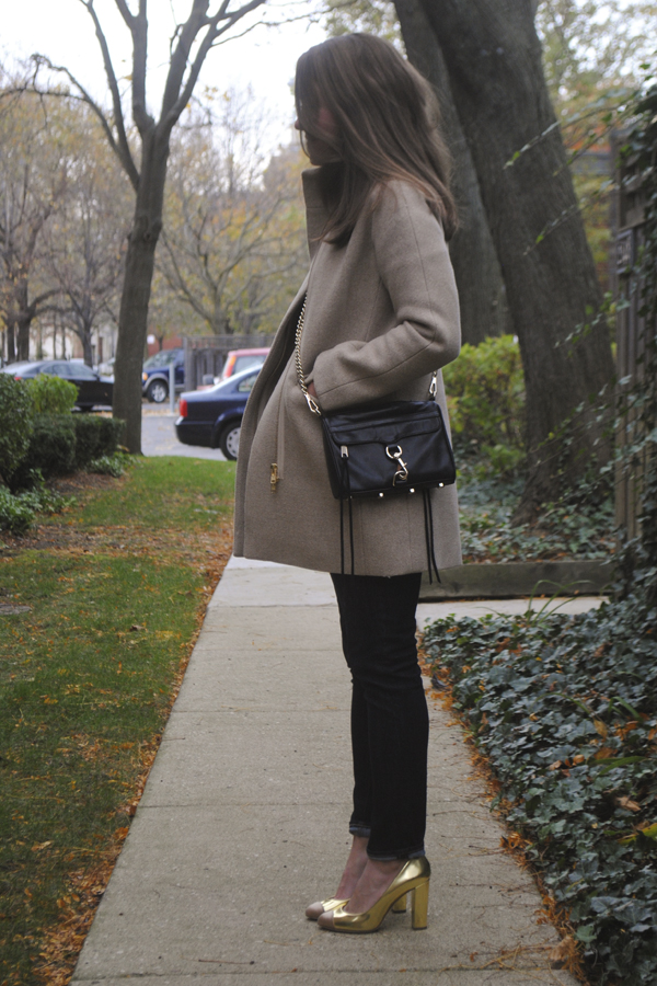 J.Crew Stadium Cocoon Coat // J.Crew Loomknit Sweatshirt // Paige Skyline Skinny Ankle Jeans // J.Crew Bow Necklace // J.Crew Metallic Etta Heels // Rebecca Minkoff Mini MAC Bag // NARS Lipstick in Heat Wave