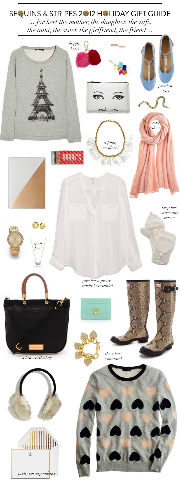 Maje Eiffel Tower Sweatshirt  //  Marc Jacobs Pom Pom Rabbit Key Fob  //  Dana Rebecca Sylvie Rose Earrings  //  Ban.do Crystal Crush Bobbi  //  J.Crew Jeweled T-Strap Ballet Flats  //  Kate Spade All Hours Winking Georgie  //  Loren Hope Layla Bracelet  //  Design Darling Gold Foil Notebook  //  Kate Spade Bobby Pins  //  Nicole Romano Prism Necklace  //  Calypso St. Barth Cushy Cashmere Scarf  //  Michael Kors Darci Glitz Watch  //  Charm & Chain Circle Monogram Earrings  //  Dana Rebecca Margo Ashley Necklace  //  Joie Osana Top  //  Shopbop Fisherman Gloves  //  Marc Jacobs Too Hot To Handle Shopper  //  Tory Burch Robinson Card Case  //  Hunter Carnaby Snake Boots  //  J.Crew Pave Heart Bracelet  //  Madewell Faux Fur Ear Muffs  //  Sugar Paper Navy Anchor Noteset  //  J.Crew Heartbreaker Sweater