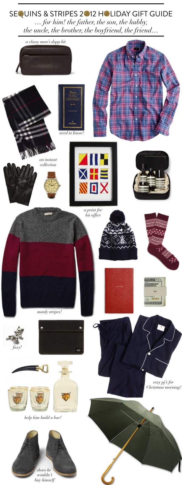 Marc Jacobs Leather Dopp Kit // J.Crew Seaside Plaid Shirt // Burberry Plaid Cashmere Scarf // How to be a Gentleman by John Bridges // Dents Cashmere Lined Gloves // Mougin & Piquard x J.Crew Watch // Scouts Honor Co. Nautical Flag Print // Aesop Dapper Gentleman Grooming Kit // Oliver Spencer Paneled Sweater // Topman Knit Cap // White Mountaineering Socks // Smythson Small Leather Notebook // Jack Spade DAD Money Clip // Burberry Fox Cuff Links // Jack Spade Tablet Pocket // J.Crew Flannel Sleep Set // Jayson Home Horn Bottle Opener // Fox Decanter Set // Opening Ceremony Desert Boots // Filson Cover Cloth Umbrella