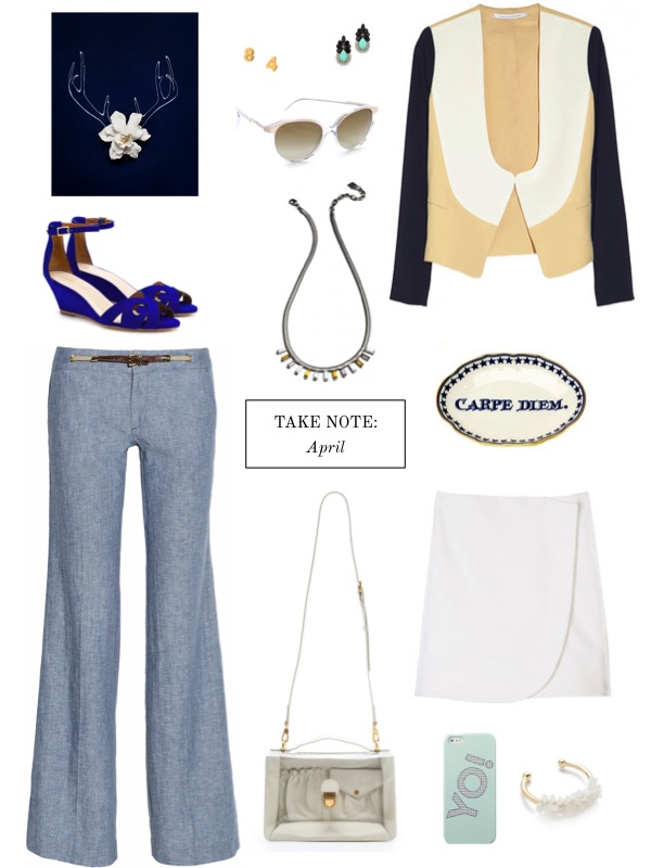 Just a collection of items to note for April! I can sense a very clean palette on my wish list for spring. Don’t you love the color in the LR wedges? That bright indigo is such a pretty hue. If you can’t tell, I’m a sucker for wide leg pants and I love the lightness of this chambray pair. Honestly, I just love it all. The jewelry, the wrap skirt, and that YO! iphone case