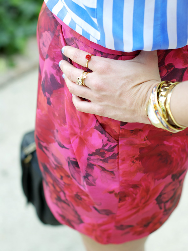 Florals and stripes, been there done that, right? Well it turns out there are a lot of stripes {weird :)} and a lot of florals in my closet so this happens much more frequently than you think. This combo feels like a no brainer to me, so for those of you that have a hard time mixing prints – I highly recommend experimenting with these two. Although black accessories don’t feel very summery, I liked the edgy feel of the black and gold against an otherwise bright outfit. Exactly how I would describe my personal style – feminine, classic, bright and a bit edgy.