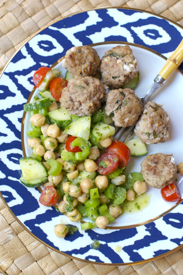 Mix the pesto dressing with the vegetables and serve with the meatballs on top or beside the salad.