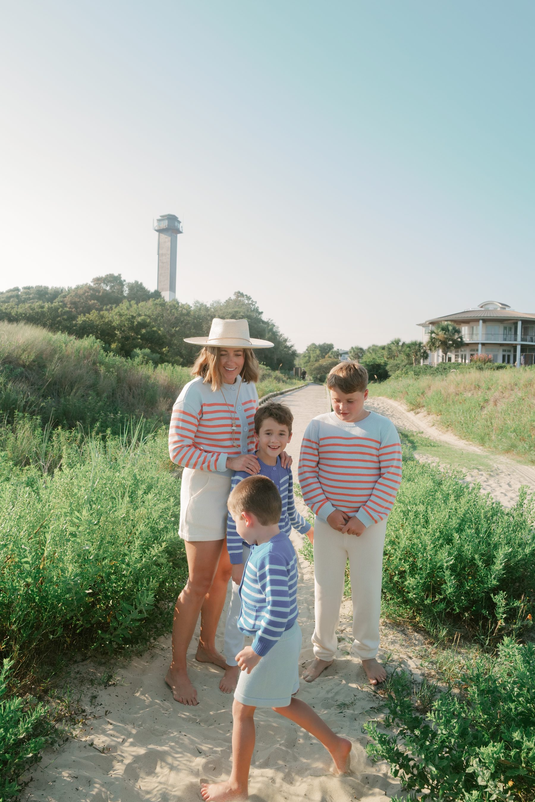 Back in the spring, I had just updated some of my branding and included in it was some really fun stripe color ways. I pitched my friend Morgan the idea of creating a colorful stripe sweater and she said “let’s do it!” As a boy mom, I am never one to shy away of color, for my kids and for myself. We went through a bunch of different color ways but ultimately decided that these timeless combos would be the most seasonal. I love the way the women’s crew and cardigan colors are the opposite in the kids (a great way to plan outfits for stripe inspired family photos).