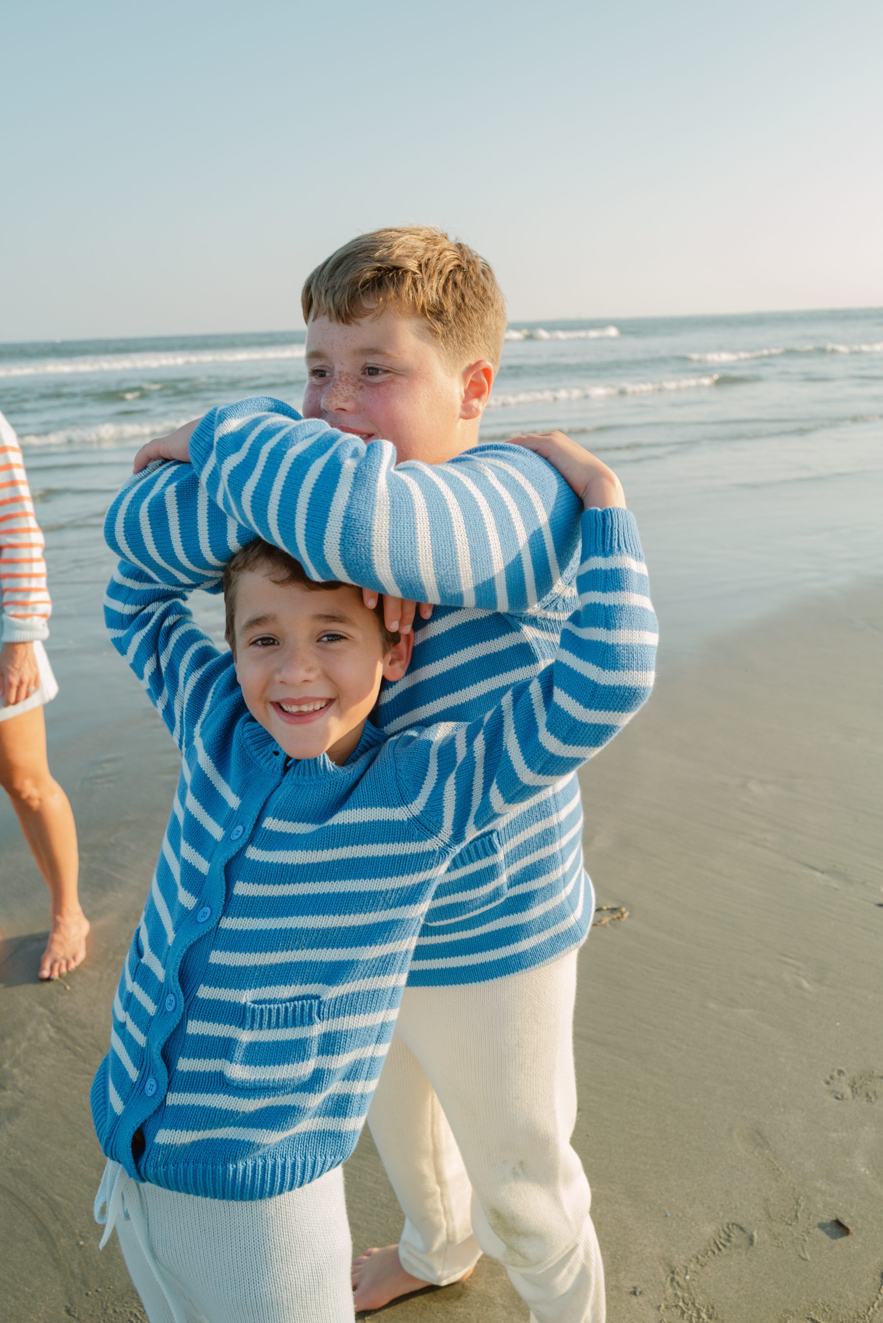 What my kids are wearing: unisex regatta and light blue stripe knit cardigan and unisex light blue and peach stripe crew sweater (I generally size up one size for all of my kids) and unisex light blue knit short (these run true to size)