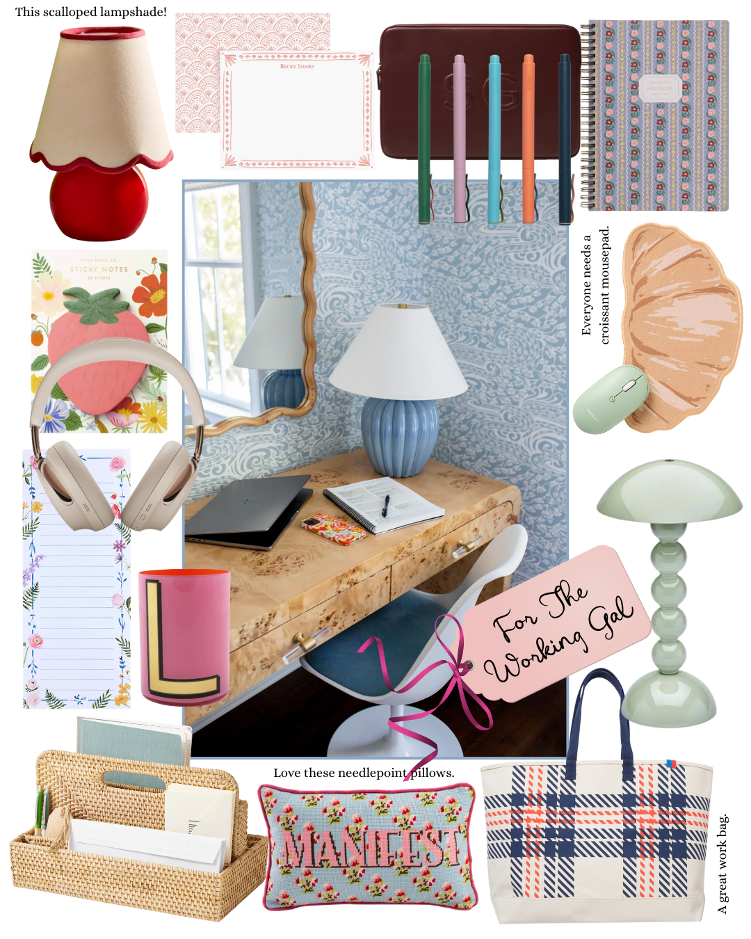 Gifts for the Working Gal: Scalloped Lamp, Stationery, Computer Sleeve, Pens, Spiral Notebook, Croissant Mouse Pad, Table Lamp, Tote, Needlepoint Pillow, Rattan Organizer, Initial Cup, Notepad, Headphones, Sticky Notes